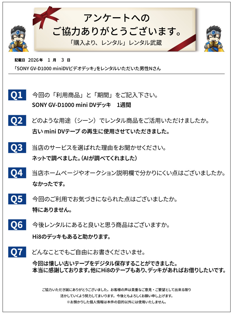 先日、「SONY GV-D1000 miniDVビデオデッキ」をレンタル頂いた男性Nさんから嬉しいお声を頂きました。
