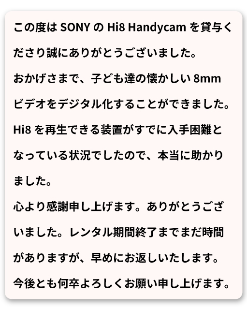 先日、「SONY Hi8 Handycam CCD-TRV92」をレンタル頂いた男性Nさんから嬉しいお声を頂きました。